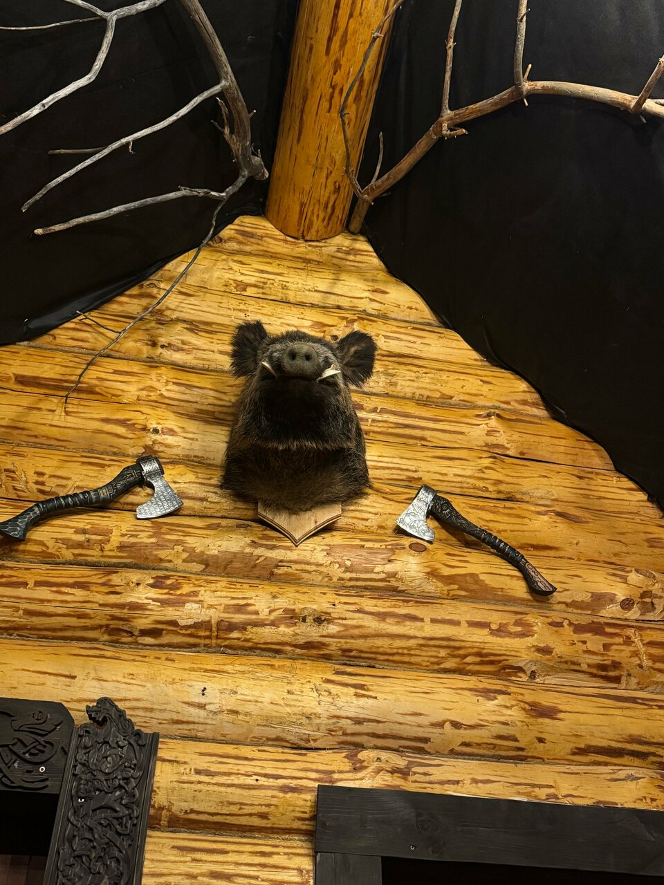 Дом продуман до мелочей, начиная от самого дома сделанного из натурального бруса и до каждой детали в декоре. Дом сделан в старорусском стиле племен Варягов , антураж, старинные двери и столешницы , каждое украшение этого дома усиливает ощущение себя в той этохе , только со всемми удобствами современного мира. Есть все для готовки , плита , кофемашина , тостер, мангал. Время как будто в этом месте замедляется и день растягивается.